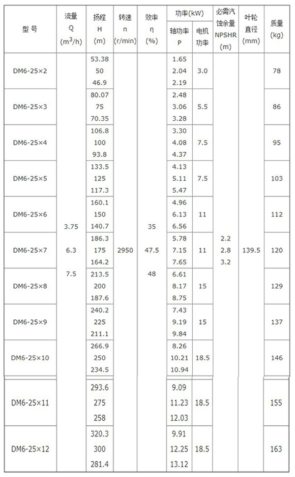 DM型多級離心泵具有揚程高、功率小、效率高、性能范圍廣、運轉安全和平穩(wěn)、噪音低、壽命長、安裝維修方便等優(yōu)點。可供輸送不含固體顆粒(磨料),不含懸浮物的清水或物理化學性質類似于清水的其它液體之用,也可通過改變泵的材質(或泵過流部分的材質),密封形式和增加冷卻系統(tǒng)用于輸送熱水、油類、腐蝕性或含磨料的介質等。該系列泵系節(jié)段式多級離心泵,采用了國家推薦使用的高效節(jié)能水力模型,具有高效節(jié)能、性能范圍廣、運行安全平穩(wěn)、低噪音、長壽命、安裝維修方便等優(yōu)點;通過改變泵的材質(或泵過流部分的材質)、密封形式和增加冷卻系統(tǒng),可輸送熱水、油類、腐蝕性和含磨料的介質等。